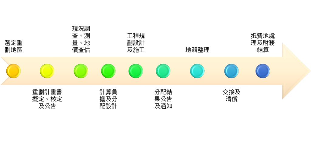 (1)選定重劃地區(2)重劃計畫書之擬定、核定及公告(3)現況調查、測量、地價查估(4)計算負擔及分配設計(5)工程規劃設計及施工(6)分配結果公告及通知(7)地籍整理(8)交接及清償(9)抵費地處理及財務結算。