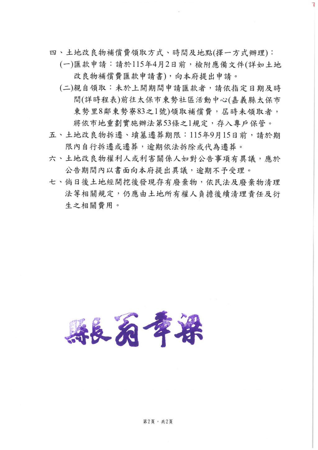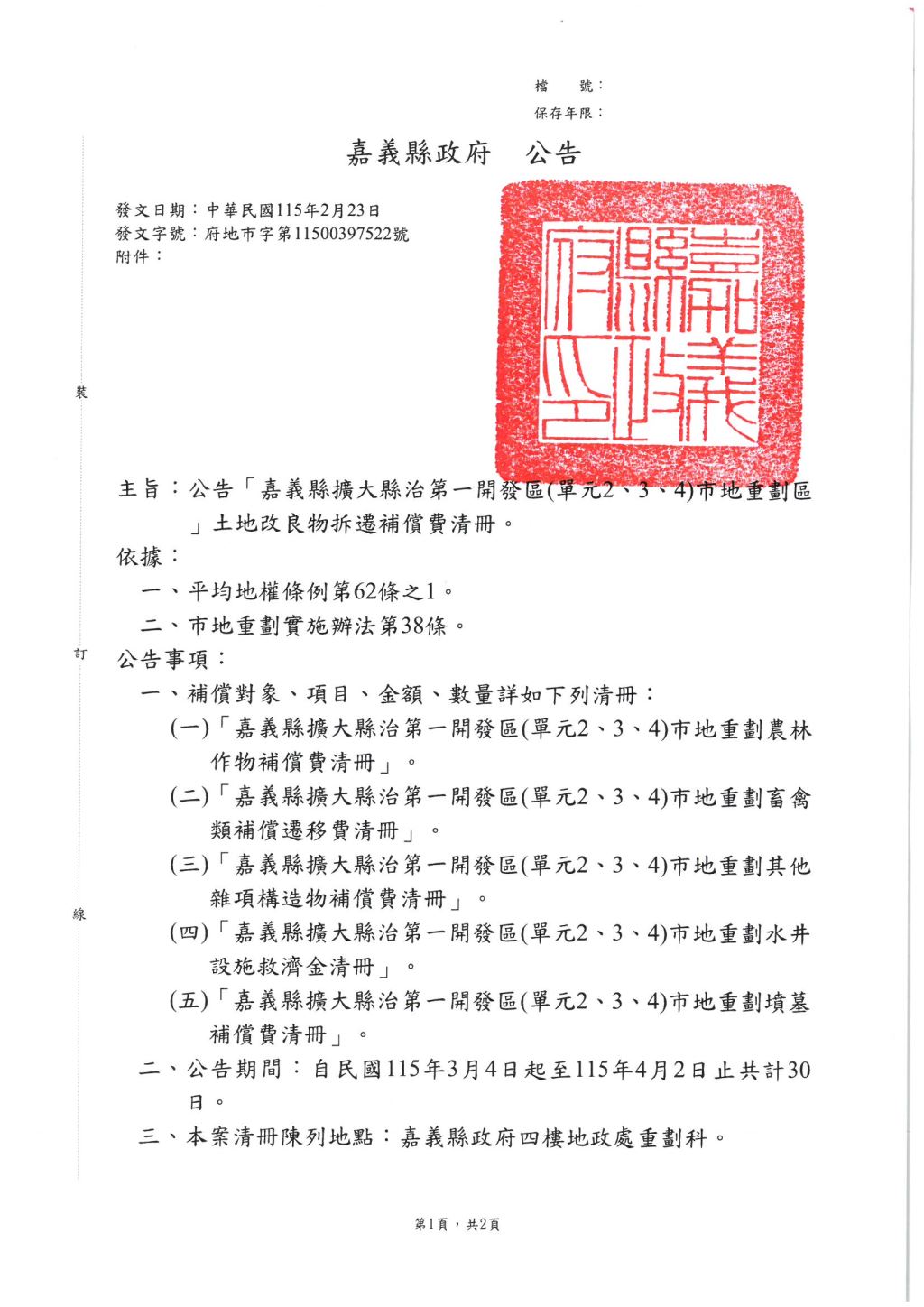 公告「嘉義縣擴大縣治第一開發區(單元2、3、4)市地重劃區」土地改良物補償費清冊